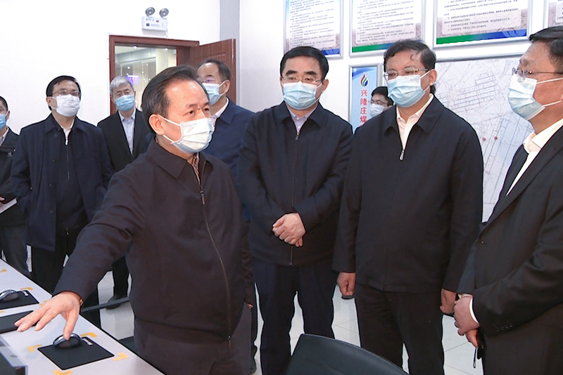 李干杰在满慎刚的陪同下,来到兴隆庄煤矿调度指挥中心,详细了解煤矿安全监测系统运行、防冲击地压监控、人员培训教育等情况,深入井下-400米工作面现场查看智能化采煤作业情况。